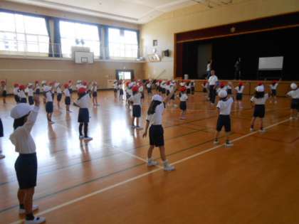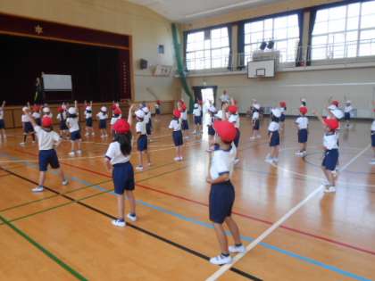 2時間目は、1・2年生が、体育館で運動会演技の練習をしました。たて・よこに列を整えて並ぶところから出だしの振り付けを繰り返し確かめながら練習をしました。