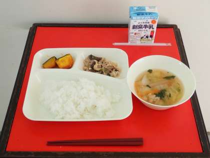 今日の献立は、豚肉と干しずいきのみそ煮、うすくず汁、焼きかぼちゃの甘みつかけ です。冬至は、一年のうちで一番昼が長く、夜が長い日です。冬至には、寒さが厳しくなる冬を、病気をせずに元気に乗り切るために、また運がよくなるようにと「ん」のつく食べ物を食べる風習があります。その一つが「かぼちゃ(なんきん)」です。
