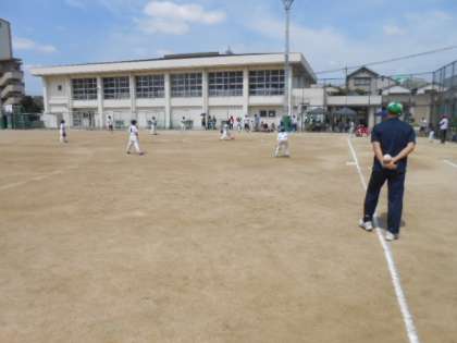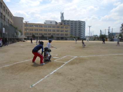 第2試合は、江口チームvs合同Bチームの対戦でした。ランナーに出たら、すかさず次のベースへの進塁を狙っていました。きわどいコースへの投球にキャチャーも後逸しないように必死で捕球していました。3塁まで進塁すると、本塁突入のポーズで、キャッチャーをけん制するシーンでは、その駆け引きに会場を沸かせていました。