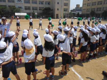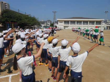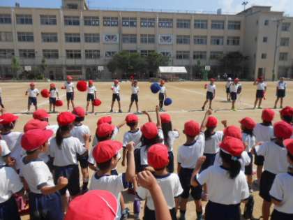 互いに相手の健闘を願うエールの交換をした後は、互いに自陣の応援を大きな声で応え合う、応援合戦を繰り広げました。さて、本番では、応援の仕方が勝敗に大きく貢献します。どちらの組も最後までがんばりましょう。