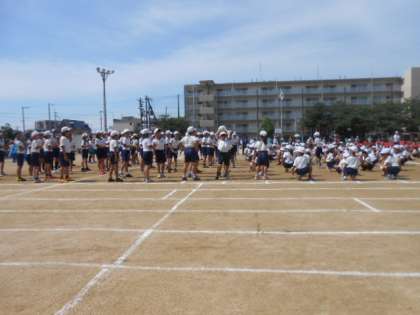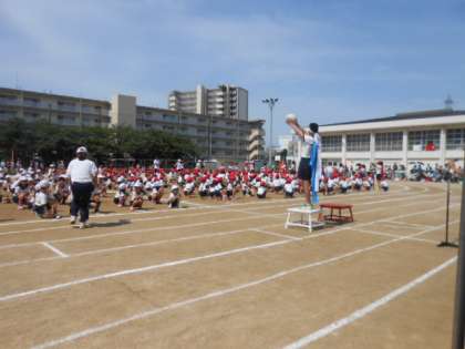 本日、爽やかな好天の下、本校運動場で、運動会を開催しました。開会式の後、全校競技「みんあでつないで」(ボール送り)、6年個人走「ファイナル ラン」、2年団体競技「力を合わせて GO!」(大玉転がし)と子どもたちと家庭、地域の皆様からの応援の歓声が、運動場にこだましています。
