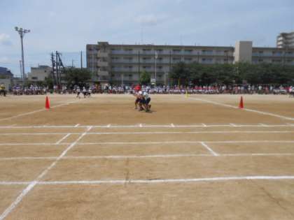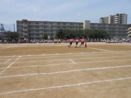 4年は、長い竹棒を台風の目に負けないような速さでコーンを回っていました。外側を受け持つ人は、振り飛ばされそうになりながら走っていました。