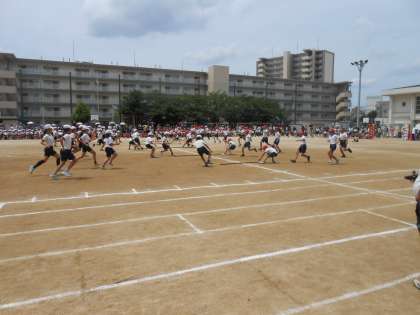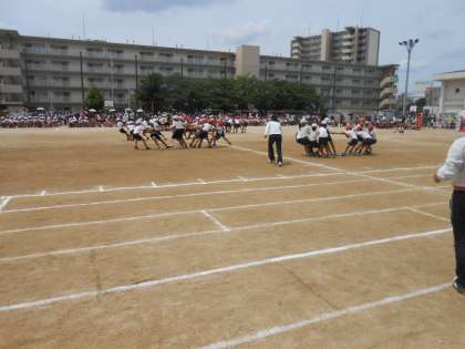 5年の団体競技「綱取物語」は、5本の綱を自陣まで引き込み合います。取られたらすぐに他の味方の応援に駆けつけます。
