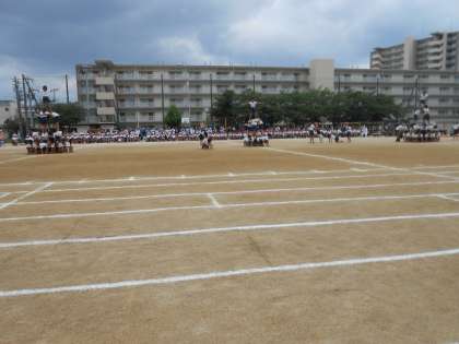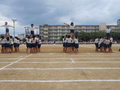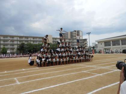 いよいよ演技はクライマックスを迎えます。4段の塔とさらには、6段の全員ピラッミドの大技の組み立てには、会場全体に緊張感が走りました。そして、見事に完成させ、会場から大きな拍手喝采が湧き上がりました。5・6年生のみなさん、最後まで集中力を切らすことなく頑張りました。とても素晴らしい演技を「ありがとう」。高学年のみなさんは、これを自信にして様々なことに力を合わせて取り組んでほしいです。