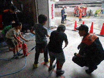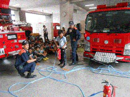 4年生が、学校から徒歩で東淀川消防署の見学に行きました。5階のホールでビデオ視聴した後、1階で、様々な説明と実演をしていただきました。水消火器の体験もしました。