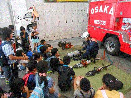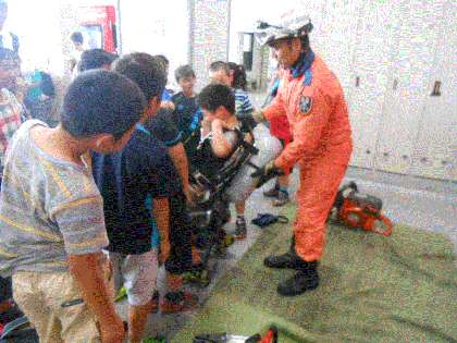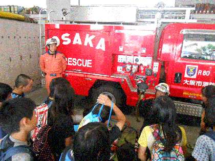 火災現場での特殊な作業に使用するレスキュー車には、約150のツールが積み込まれています。そのうちのカッターや空気ボンベ、煙中カメラなど4点のツールについて詳しく教わりました。