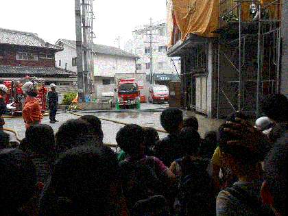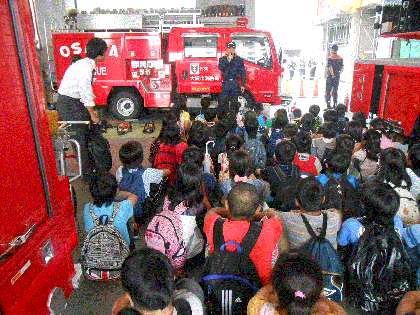 消防隊の訓練の様子を見学し、火事現場を想定した訓練場での隊員の方たちのきびきびした行動に子どもたちは、息をのんで見入っていました。最後に貴重な学習の場を提供していただいた、東淀川消防署の方々に、感謝の気持ちを込めて、元気にお礼を言って消防署を後にしました。
