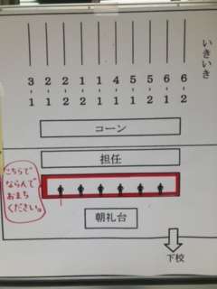 運動場に学年組のボードを置いていますので、お子さんの学年組の前で、住宅の方を向いて並んでお待ちください。