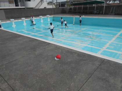 本日6時間目、委員会活動で、運動委員会の児童とプール掃除をしました。明日には、新しい水が満たされて、気持ちよく水泳学習ができると思います。児童の皆さん、楽しみにしていてください。運動委員会の皆さん、ご苦労様でした。