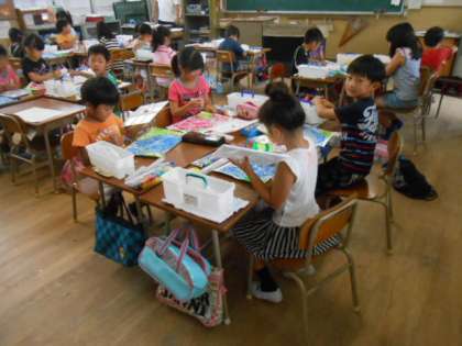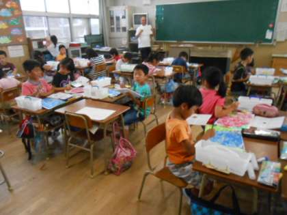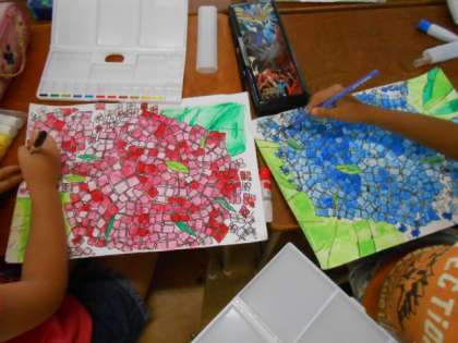 2年生が、図画工作の授業で、この梅雨の季節を代表するアジサイの花を色鮮やかに描いていました。蒸し暑さを忘れるほど、すてきな作品ができあがっていました。