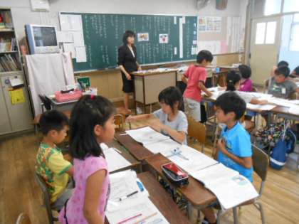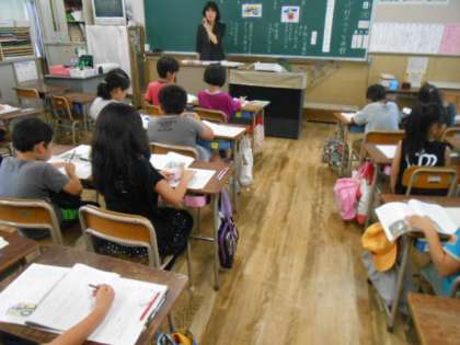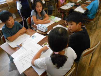 6日(月)5時間目に、3年1組で国語科の研究授業を行いました。物語「夕すげ村の小さな旅館」を教材にファンタジー作品を楽しむ読みとりをしました。場面と場面を関連づけて読み、登場人物の様子や気持ちの変化を想像して、そこに潜む「しかけ」を見つけながら読みとりました。グループの中で自分の考えを伝え合ったり、意見をまとめて発表したりする言語活動もできました。