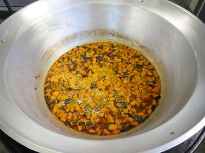 大阪市の給食では、生のかぼちゃとあずき(ドライパック)とを煮ています。