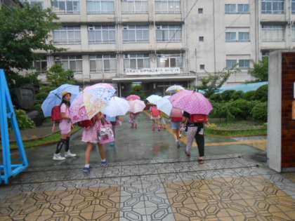 昨夜、台風11号の暴風警報が発令されましたが、夜半には解除となり、学校は通常通りとなりました。今朝、児童は、悪天候の中を元気に集団登校しました。明日は、終業式です。