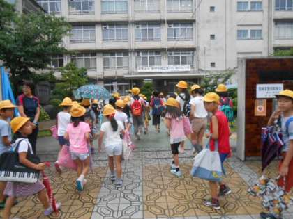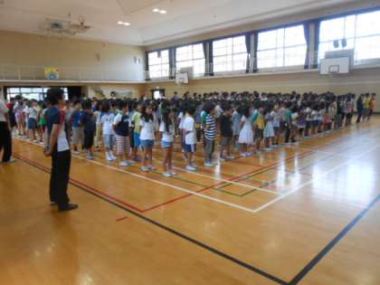今日は、1学期の終業式です。児童たちは、土曜授業ですが、いつものように元気に集団登校しました。9時から体育館で、1学期の終業式を行いました。