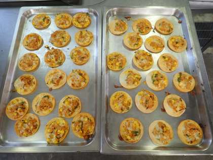 大阪市の給食の変わりピザは、ぎょうざの皮に、ツナやコーン、ピーマン、ピザソース、チーズを混ぜ合わせた具をのせ、焼き物機で焼いています。