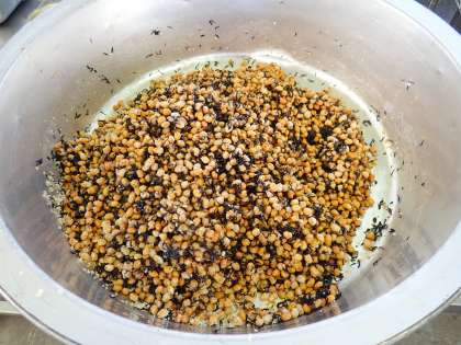 ひじき豆は、油であげた大豆に、ひじき、砂糖、こいくちしょうゆを合わせたたれをからませて作ります。