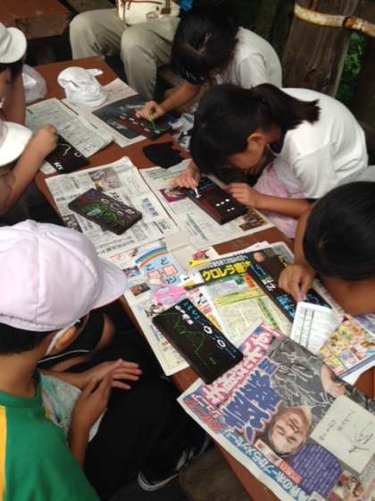 昼食の後、焼き板の絵付けや仕上げ作業をしました。いいお土産ができました。入浴・夕食をして夜の集いと夜間ハイキングをします。