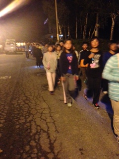 夜の集いの後、ナイトハイキングをしました。自分たちの町の夜道より、明かりがほとんど無い真っ暗な森林の山道を歩く体験をすることができました。