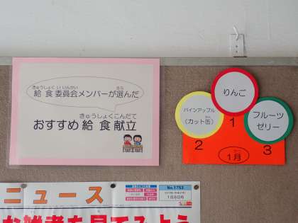 給食委員会の委員も、今月の給食献立の中から「フルーツゼリー」をおすすめしています。