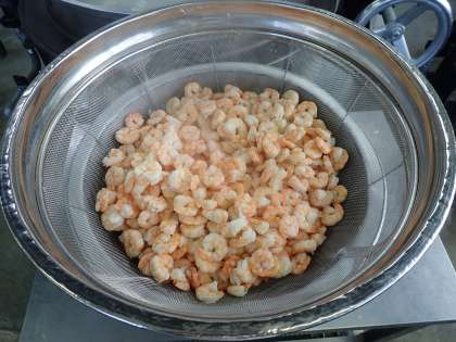 ゆでたえびに料理酒で下味をつけ、しょうが、にんにく、白ねぎ、トウバンジャン、たまねぎ、砂糖、こいくちしょうゆ、ケチャップを使ってチリソースを作り、えびとからめます。