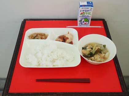 今日の給食には、鶏肉のみそバターソースが登場しました。