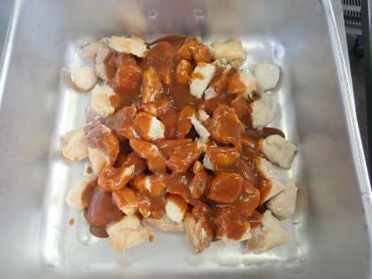 鶏肉に料理酒で下味をつけて焼き、八丁みそや赤みそ、バターなどで作ったソースをかけます。