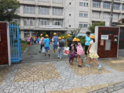 両手のカバンには、夏休みの作品など思い出が、いっぱい詰めこまれているようです。 たくさんの明るく元気な笑顔に出会いました。