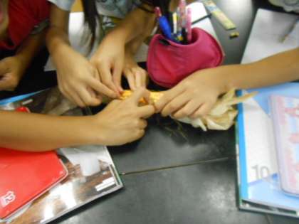 5年生は、理科「植物の発芽と成長」の学習をしています。学習園で栽培したトウモロコシの実を細かく観察して、グループで気づいたことを話し合いました。