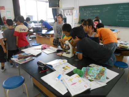 5年1組が、理科「花から実へ」の学習で、ヘチマやカボチャの花や実を観察しました。顕微鏡でそれぞれのおしべの花粉を調べ、拡大された花粉の様子に関心を持って、植物によって異なることなどを記録していました。顕微鏡の操作を互いに協力して教え合いながら順番に観察していました。