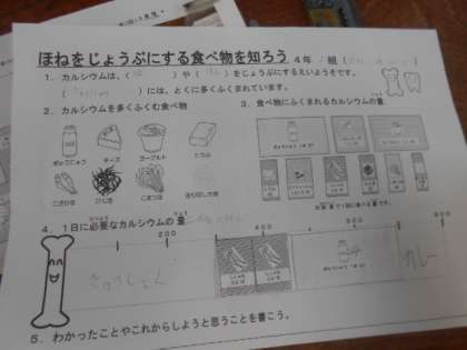 栄養指導では、区内の学校栄養教諭の先生からカルシウムを多く含む食べ物や食べ物に含まれるカルシウムの量、そして、1日に必要なカルシウムの量等を学びました。学習後の振り返りで、ある児童は、「こんなにカルシウムが入っている食べ物があるとは、思わなかったからこれからは、カルシウムがいっぱい入っているものを食べようと思いました。」と書いていました。育ちざかりの子どもたちには、カルシウムなどバランスのとれた食事をしっかり摂ることがとても大切です。
