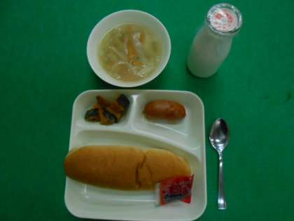本日の給食の献立は、フランクフルトのケチャップソース、スープ、焼きかぼちゃ、パン、牛乳でした。