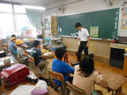 5年 特別活動の授業 「けん玉名人に学ぶ」では、まず、けん玉で積み木をしたりしてけん玉を好きになることから始まりました。よい持ち方や構え方を教わり、いよいよ基本技に取組み、「けん玉道検定」に挑戦しその成果をたしかめました。最後に、三上先生にけん玉の高度な技を披露していただきました。児童は、先生の華麗な技に釘づけでした。しかし、先生からは、華麗な技に気を取られることなく、より基本的なことに緊張感を持って取組み、目の前の壁に挑戦して乗り越える強さが、大切であることを教わりました。
