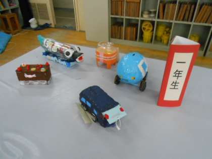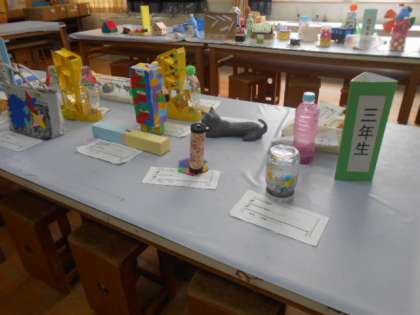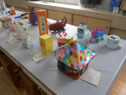 1階 図工室で、アイデア貯金箱作品展示をしています。