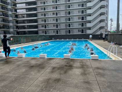 アヒルさん体操をして、みんな元気いっぱいプールを楽しんでいる様子です。