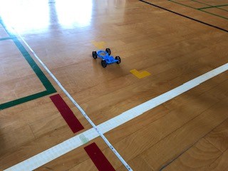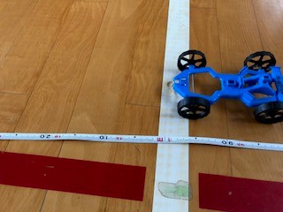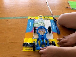「ゴムをのばす長さをかえると、ものを動かすはたらきは、どのようにかわるのだろうか。」という問題を解決するための実験をしているところです。ゴムを5センチメートル、10センチメートル、15センチメートルのばすと、実験用の車は、それぞれどれぐらいの距離を移動するのかをたしかめていきました。