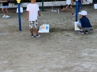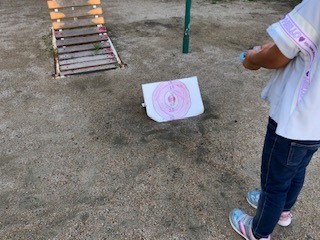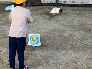 1年生が、生活科でつくった的に向かって、水でっぽうで水をとばしています。