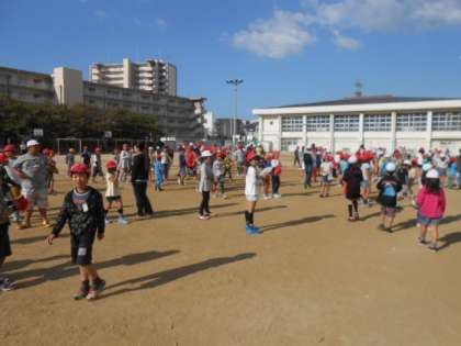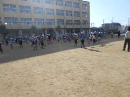 毎週木曜日、朝の時間は、児童集会があります。今回は、全校で、「増え鬼」をしました。広い運動場を、捕まらないように必死に走って逃げますが、みるみる赤帽子の鬼が増えていきました。