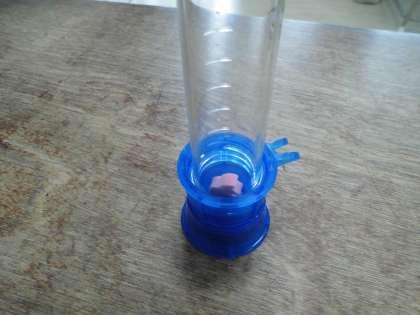 空気の体積が小さくなる様子がわかるように、スポンジのクジラを中に入れて押してみると・・・・。「クジラが小さくなった!」