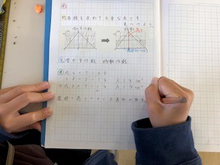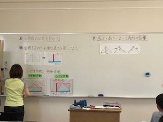 三角形のまわりを長方形で囲み(写真を参考)、その長方形の面積の半分が三角形の面積の大きさだと気づいていきます。