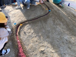 流れる水のはたらきには、どんなものがあるのかを調べるために、実際に土山に川を作ってペットボトルで水を流していきました。