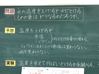 今日のめあては、「水の温度を上げると、水に溶けるものの量は、どうなるのだろうか。」です。