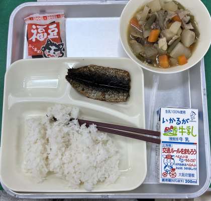 今日の給食は、節分の行事献立として「鰯の生姜醤油がけ」「いり大豆」を食べました。