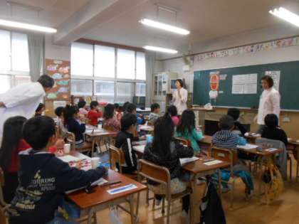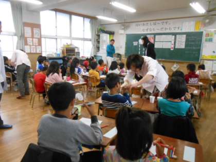 2年生が、2,3時間目に歯磨き指導を受けました。学校歯科医の先生と歯科衛生士の先生が、磨き残しの箇所が分かる染出しを鏡で見ながら、歯磨きの状態について、一人一人の児童にアドバイスをしてくださいました。今日教わったことを守って、食後の歯磨きをきちんとし、歯を大切にしましょう。
