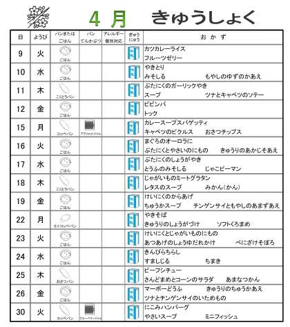 4月分の献立は、新年度が始まり、1年生が入学して間もない時期ですので、児童の食べやすさに配慮した献立がたくさん登場します。