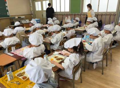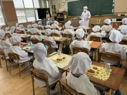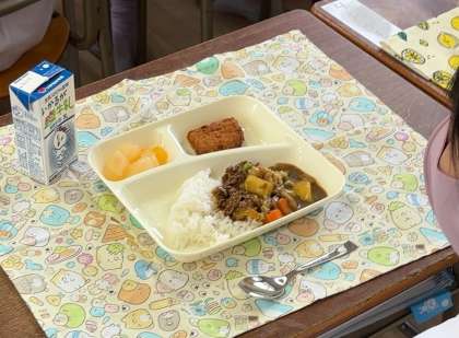 今日から給食が始まりました。1年生にとっては、初めての給食です。みんな、おいしそうに食べていました。メニューはカツカレーとフルーツゼリーです。