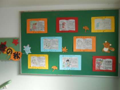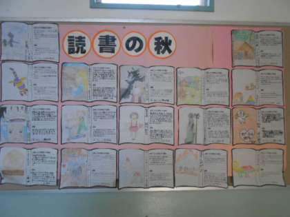 学校の階段の踊り場にある掲示板には、国語科学習で作成した「おすすめの本」を紹介したリーフレットやカードが掲示されています。これらも参考にして、たくさんの本を読みましょう。