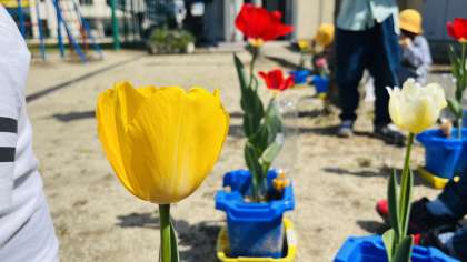1年生のときに植えたチューリップがきれいにさいています。2年生では何を育てるのか、今から楽しみです。