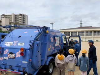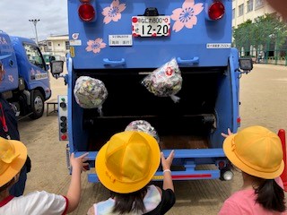 2時間目に、運動場でパッカー車に自分でごみを入れる体験やパッカー車の見学をしました。おそるおそるごみをパッカー車に投げ入れる子もいましたが、全員体験することができました。3時間目は、多目的室でごみの分別について、ゲームをしながら楽しく学ぶことができました。