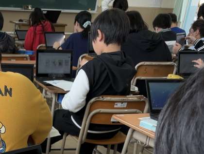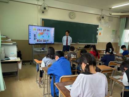 世界地図をもとに調べたい国を選んで、インターネットで国旗の由来や産業、食べ物などについて調べていきました。参観に来ていただいた保護者の皆さんを意識してか、みんなはりきっていたように思います。