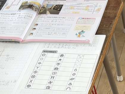 地図に書かれた記号の意味をみんなで調べていきました。学校、病院、郵便局。。。おぼえると地図を見るのが楽しくなりますね。